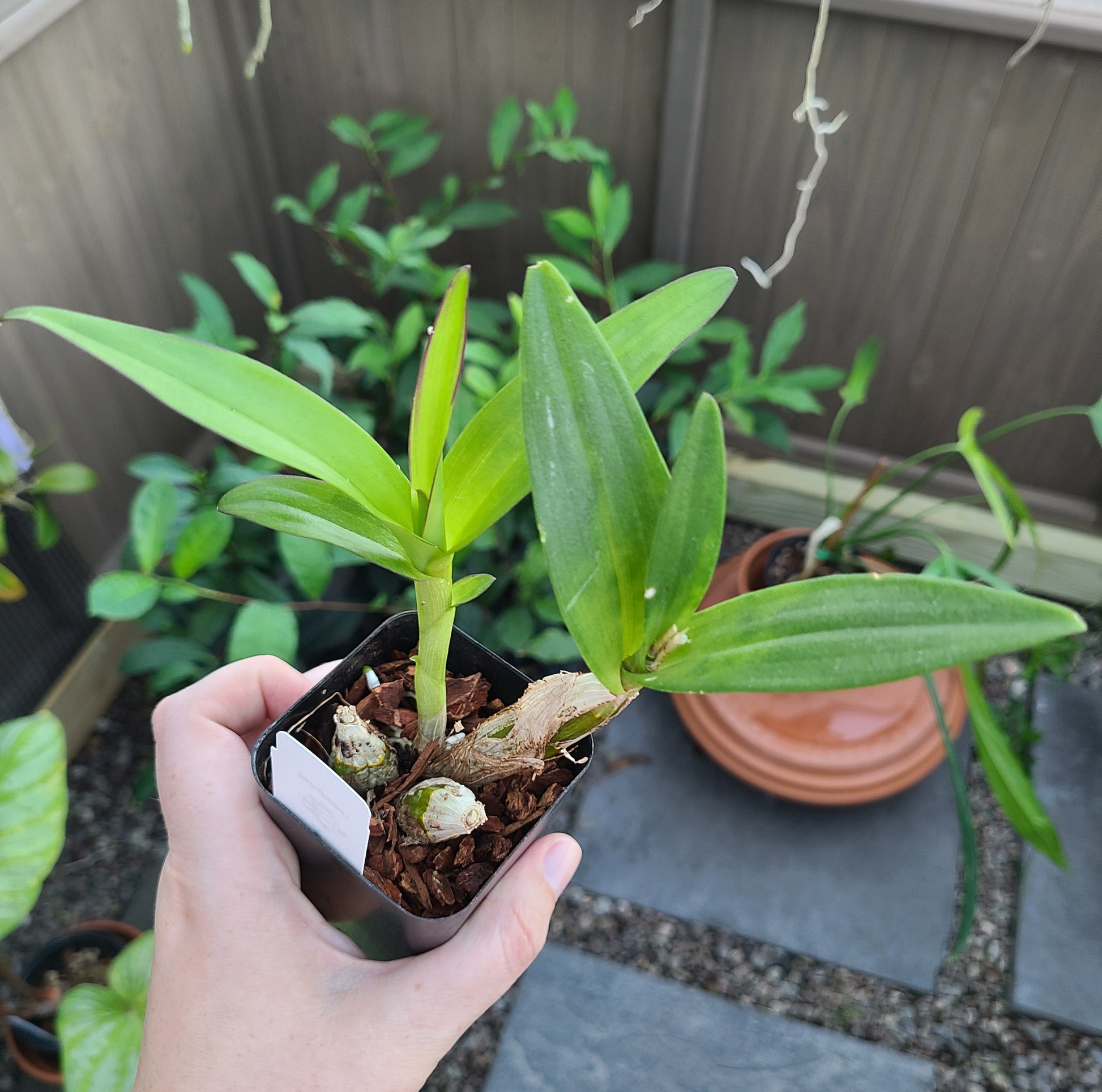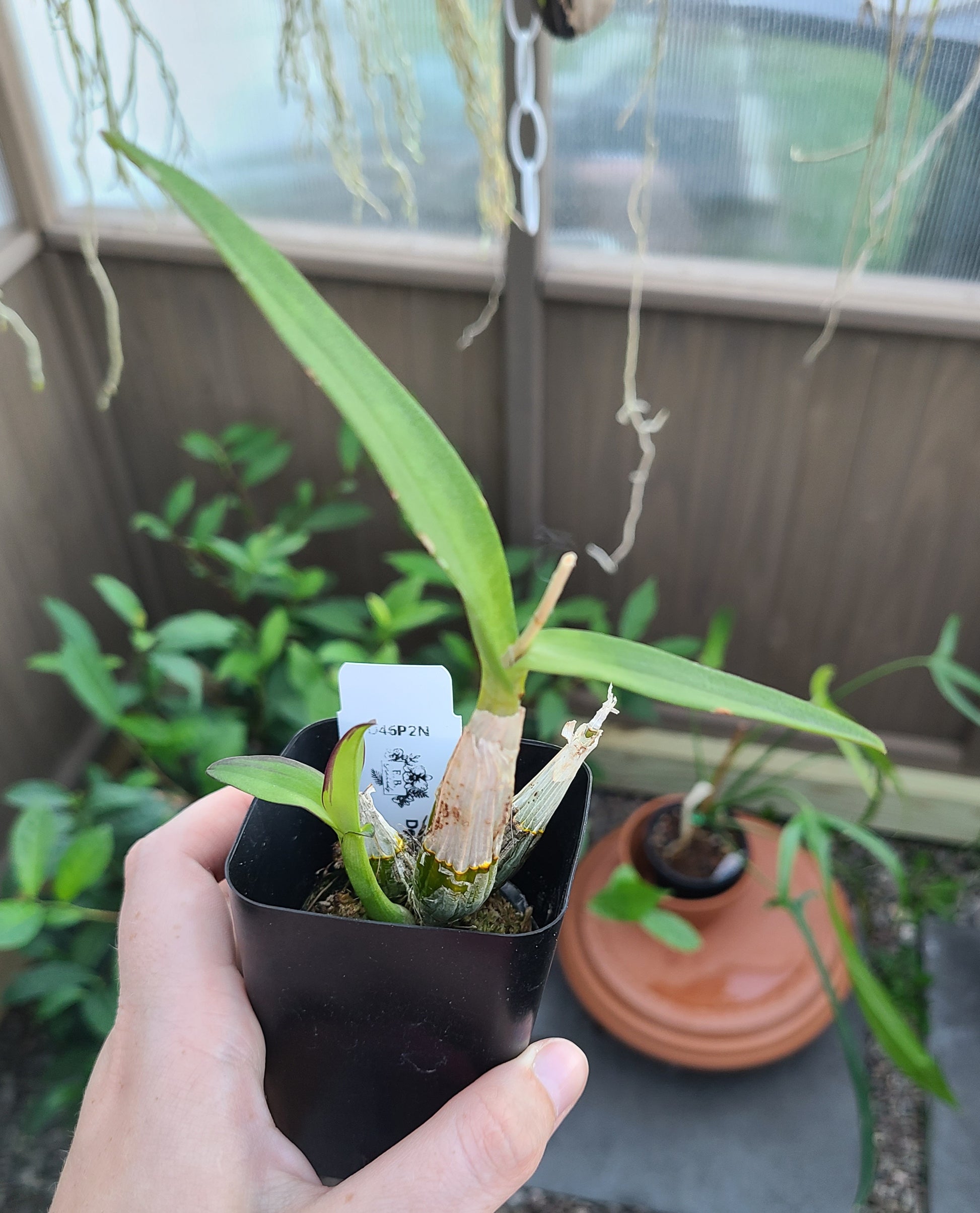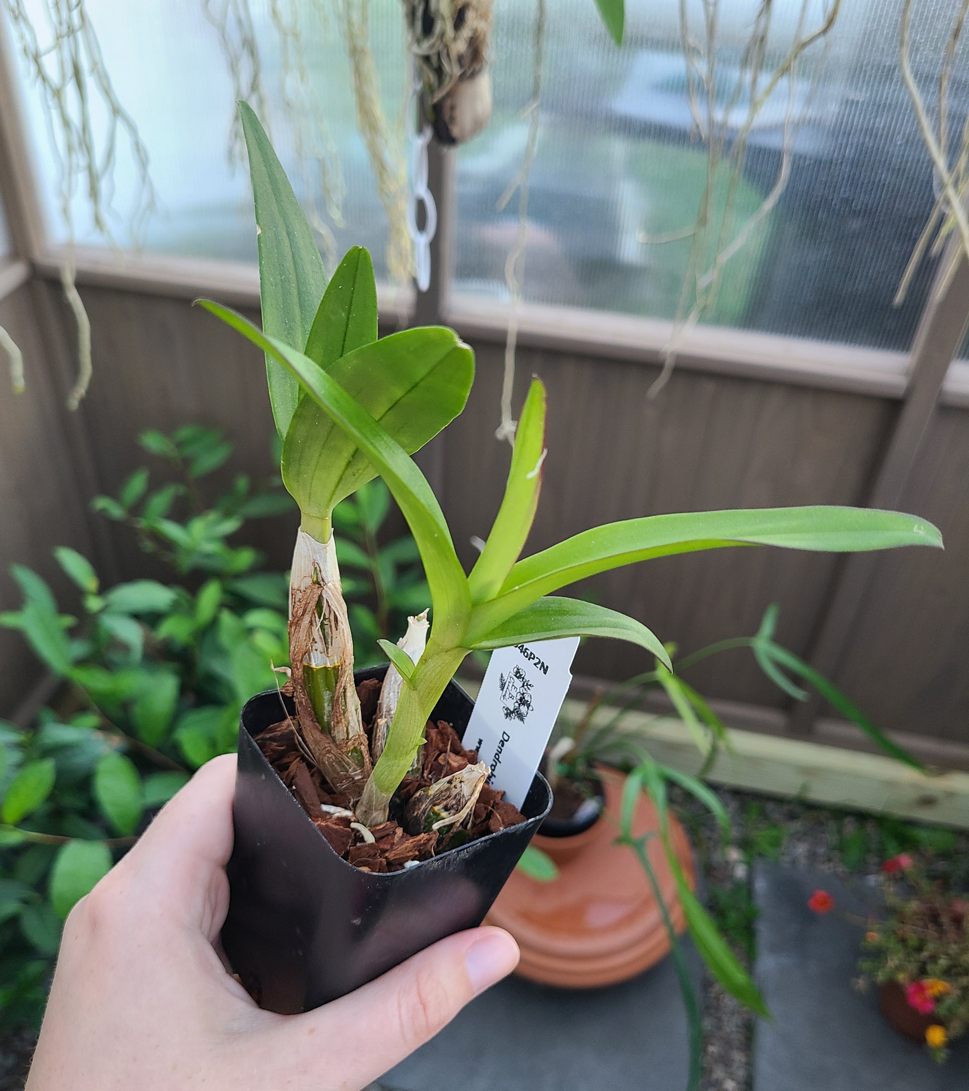 Near blooming size in 2" pots.