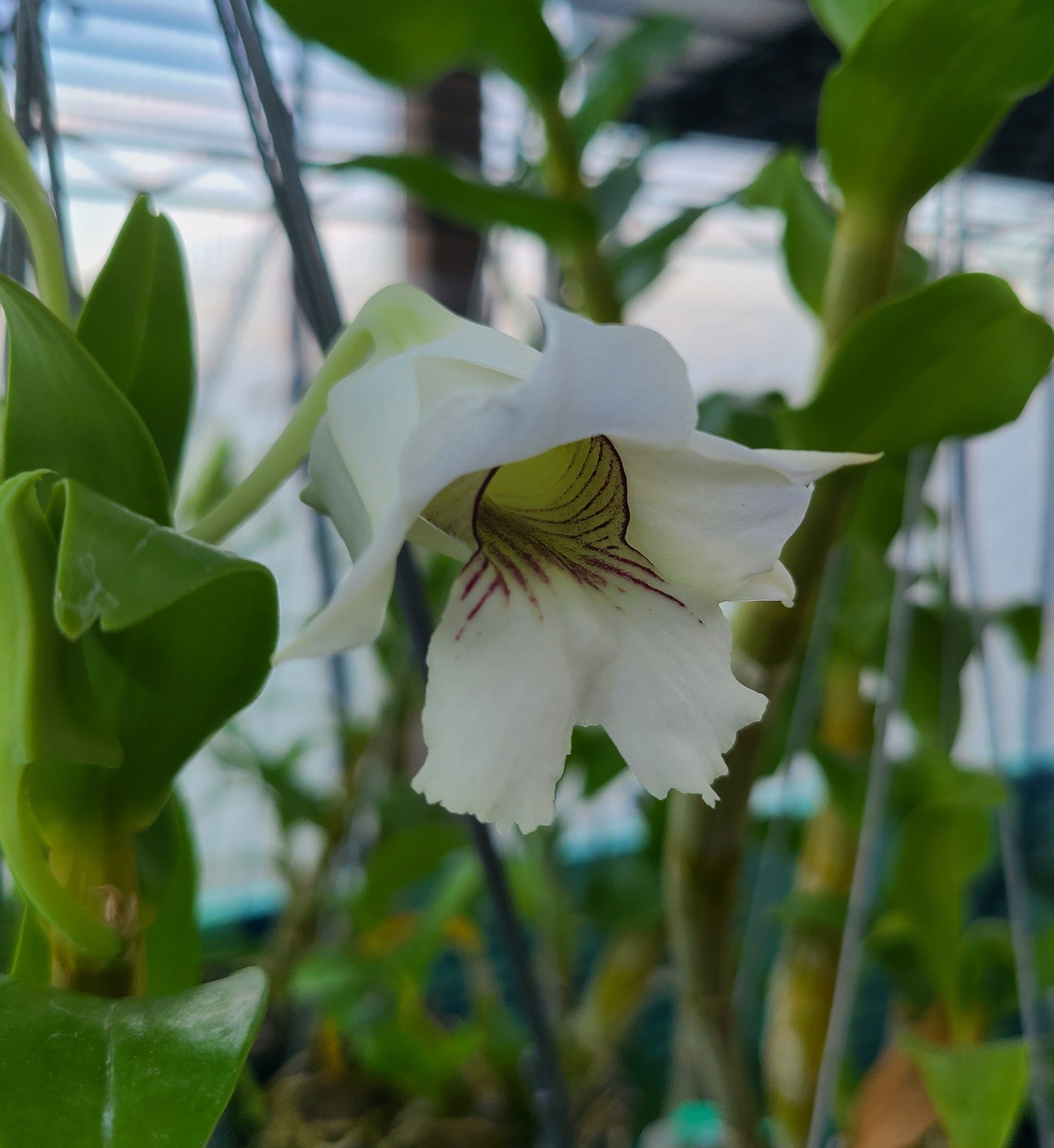 A Dendrobium species native to the Philippines. Blooms in clusters of white flowers with purple striations and a green center. Flower characteristics vary somewhat from plant to plant.