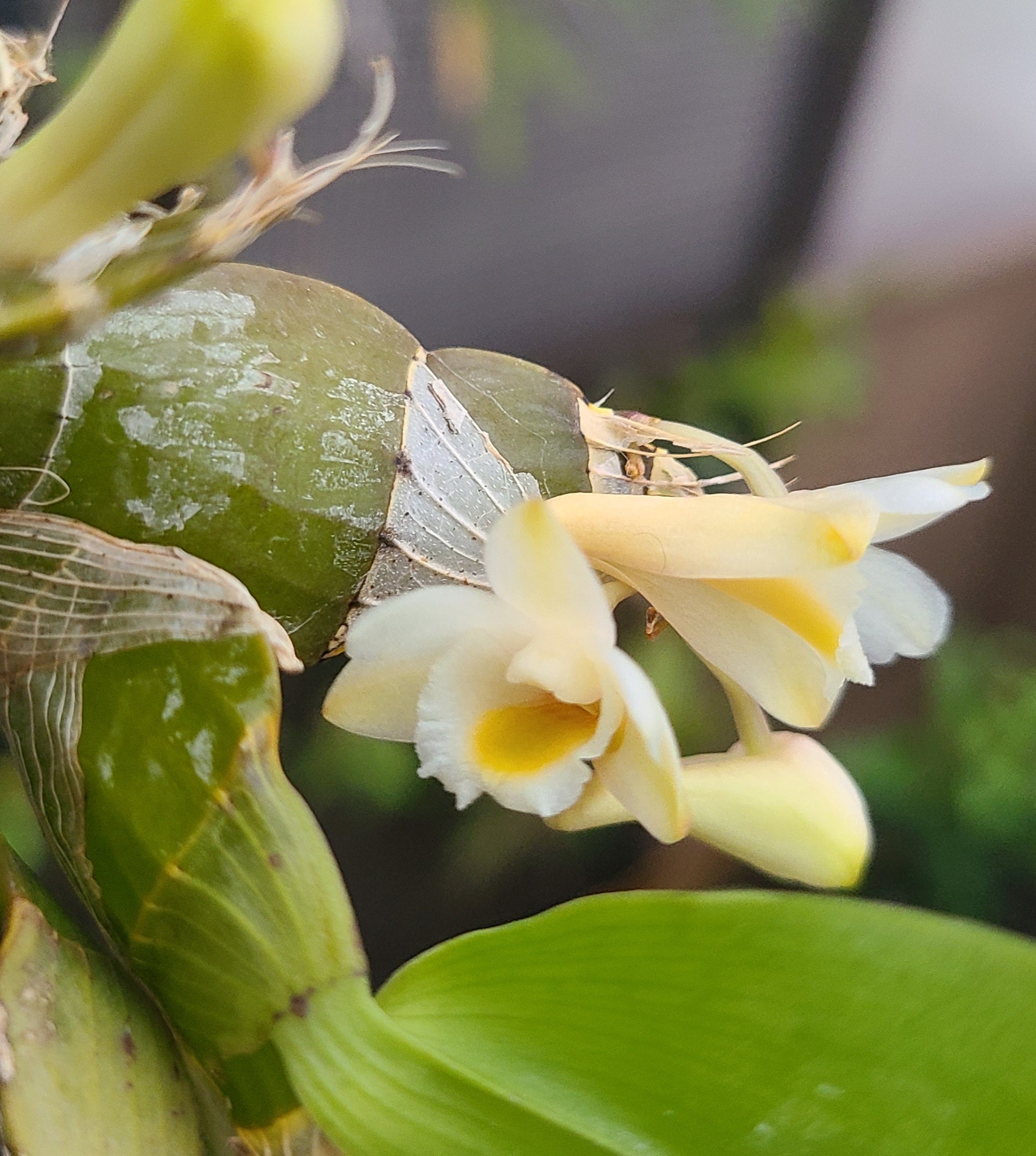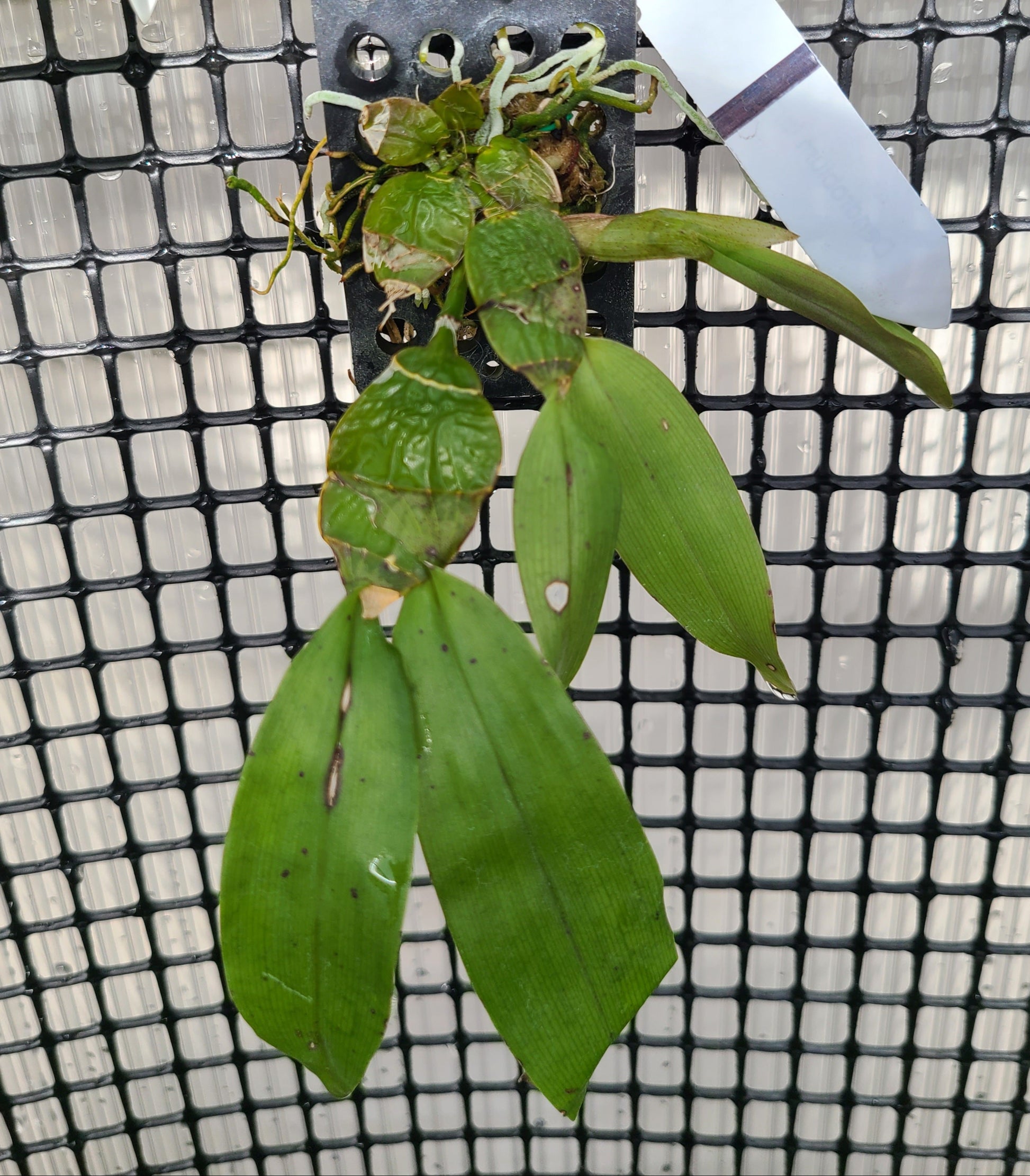 A small, warm growing species endemic to Java with unique, flat pseudobulbs (canes). Plants bloom late winter through late spring with several yellow flowers which emerge from the ends of the canes.