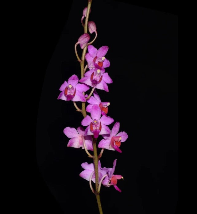 This species is native to Burma, Vietnam, Malaysia, and Sumatra. This form's flowers feature dark, intense pinks and purples. It keeps a compact growth habit, making it an excellent choice for collectors with limited space.