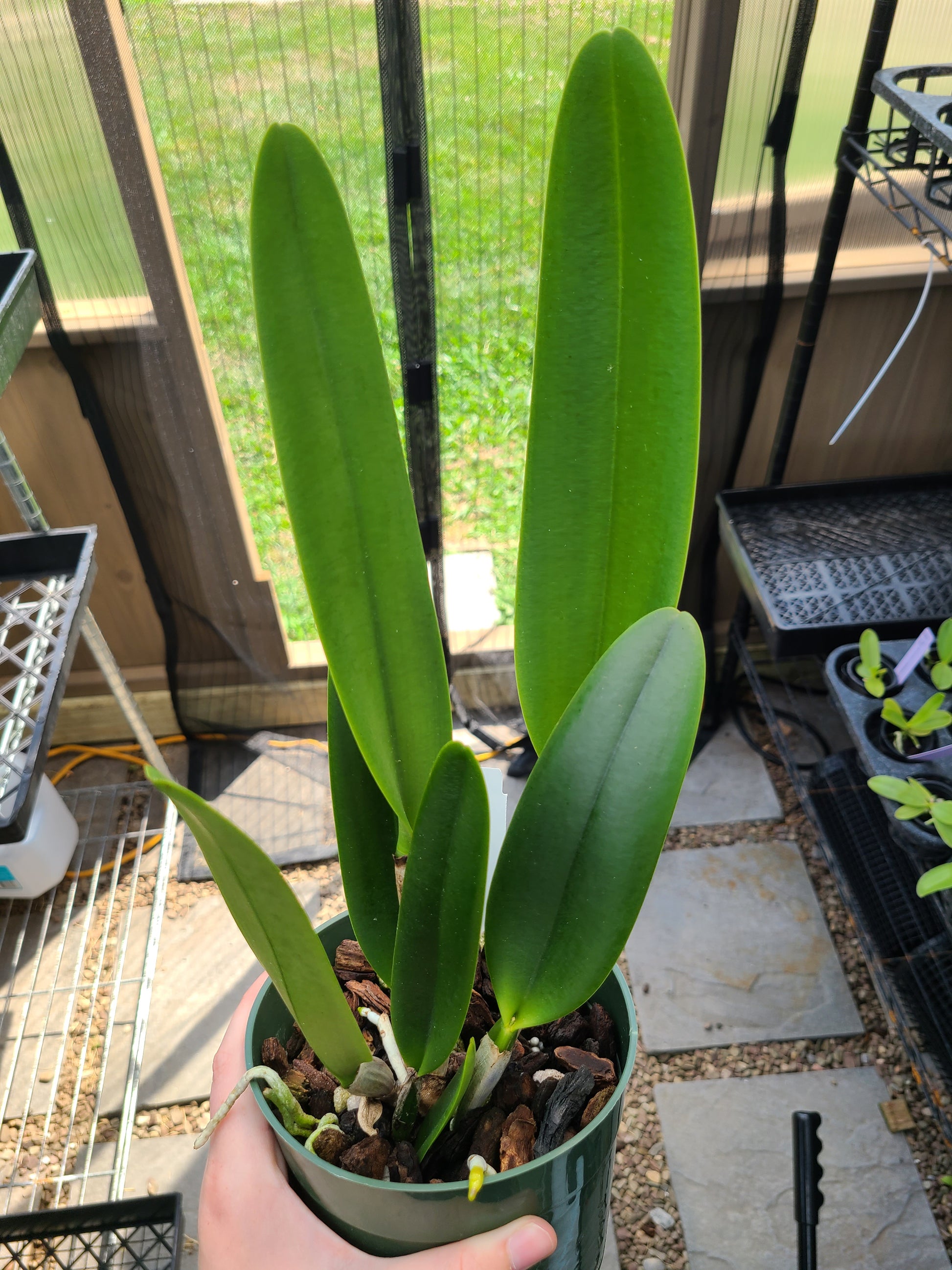 A fall-winter bloomer with beautiful white flowers with a yellow lip and pink flaring edges.